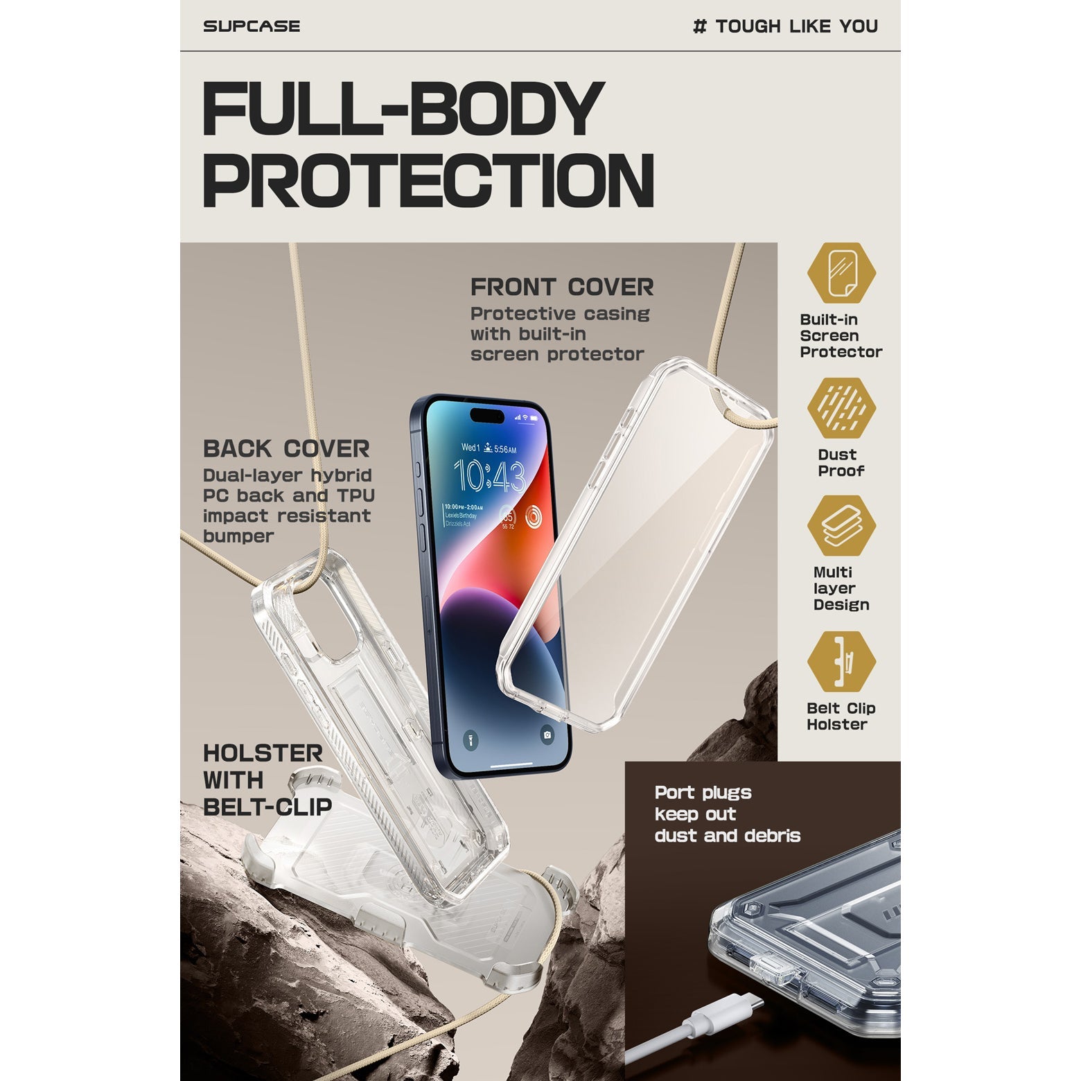- Full-body design includes built-in screen protector